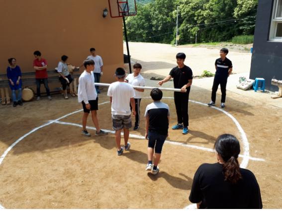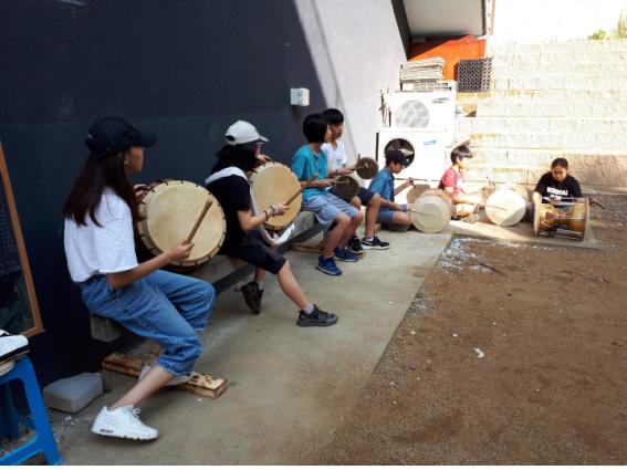 8학년의 북소리에 맞추어 부채꼴 마당으로 후다닥 나갑니다.