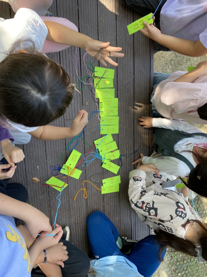 아이들이 둥근 원을 만들어 아침시와 가을 노래를 부르고, 체험장으로 올라가