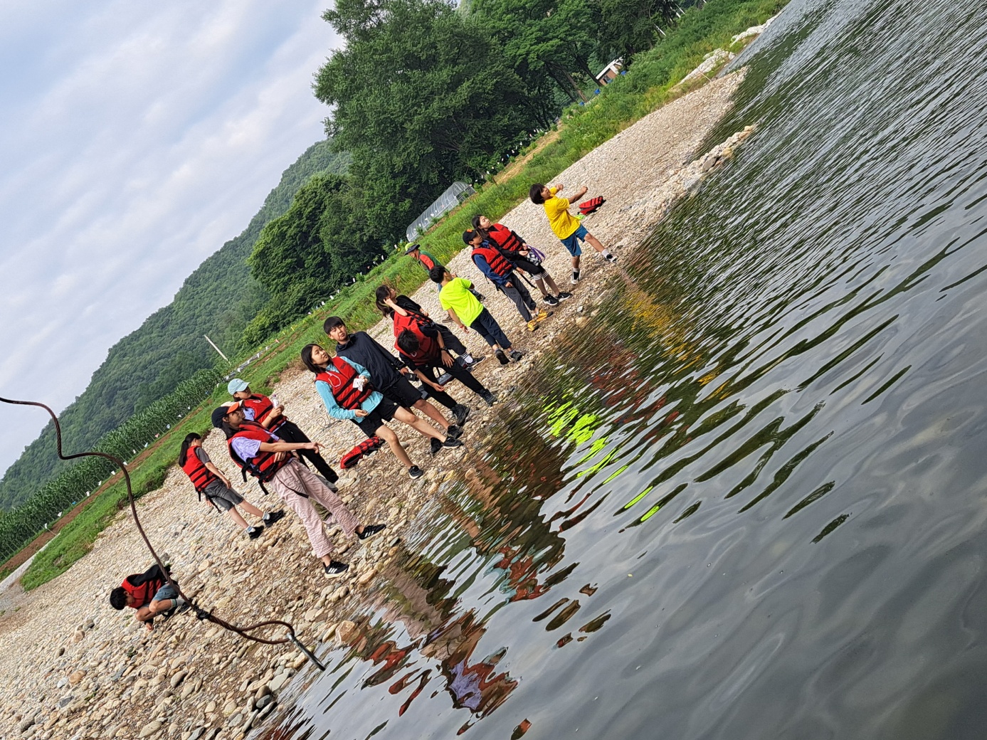 9시즘 해설사님이 오셔서 동굴체험복과 장화를 신고 장갑을 끼고 헬멧까지 완벽한 무장하고 강으로 갔다.